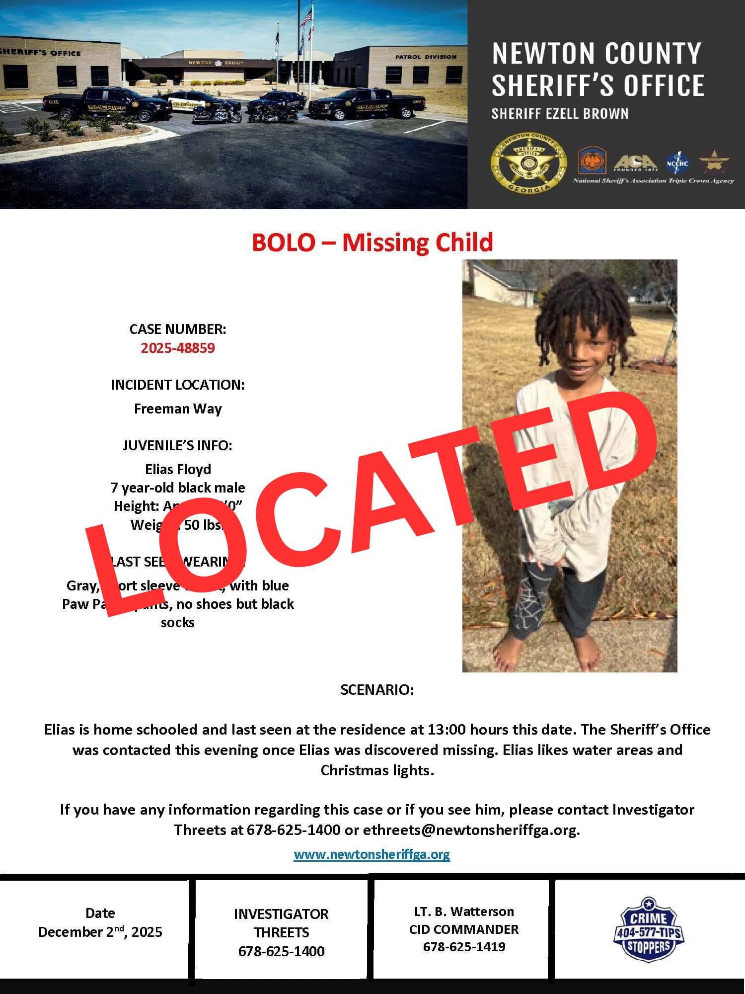 Elias Floyd has been found safe. The Newton County Sheriff's Office confirmed that the 7-year-old, who had been missing since 1 p.m. on December 2, 2025 from Newton County, Georgia, was located the same day..